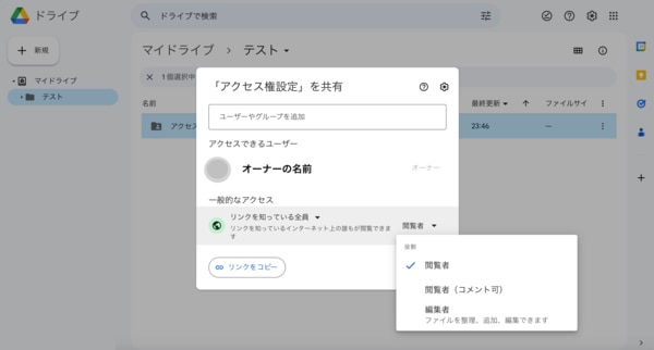 これらのアクセス権限を設定するには、共有設定画面でロールを変更することができます。たとえば、所有者の権限を変更するには、共有設定画面でロールを変更することができます。また、編集者の権限は、ファイルやフォルダーに対する編集権限を保持しています。閲覧者の権限は、ファイルやフォルダーに対する閲覧権限を保持しています。